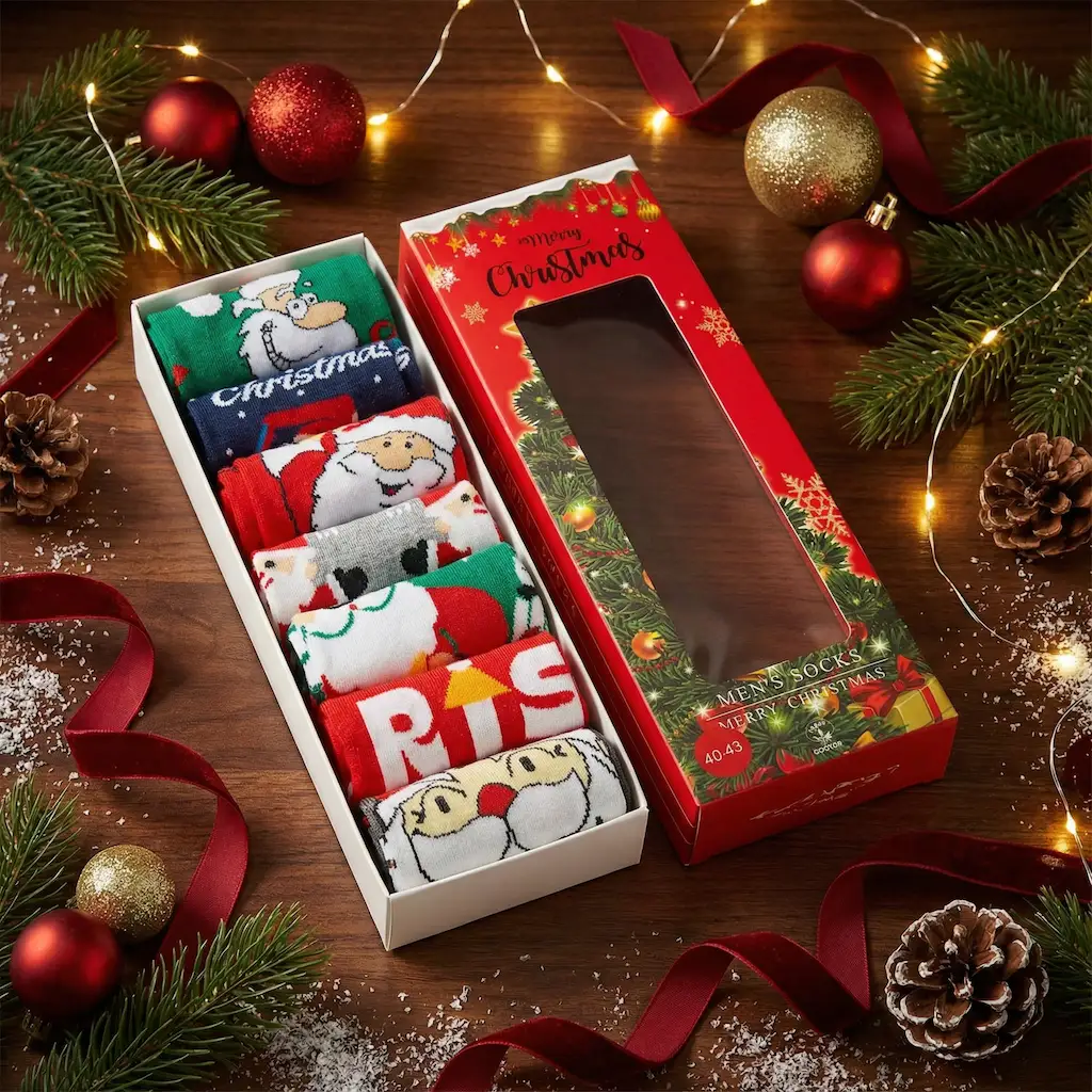 🌟 Elegantné balenie: Ponožky sú zabalené do estetickej krabičky s vianočným motívom, ktorá nielenže skvele vyzerá pod vianočným stromčekom, ale tiež eliminuje potrebu ďalšieho balenia darčekov.